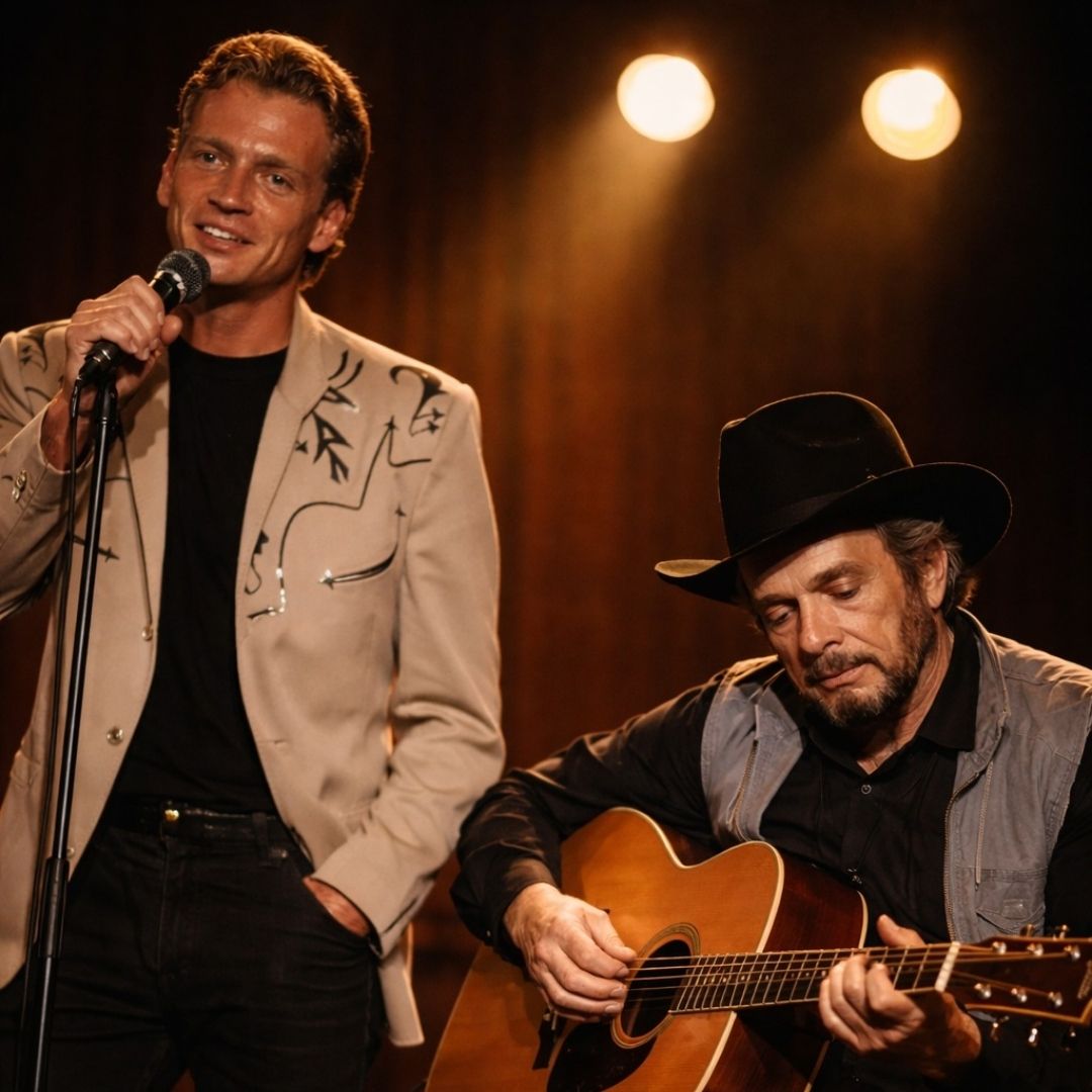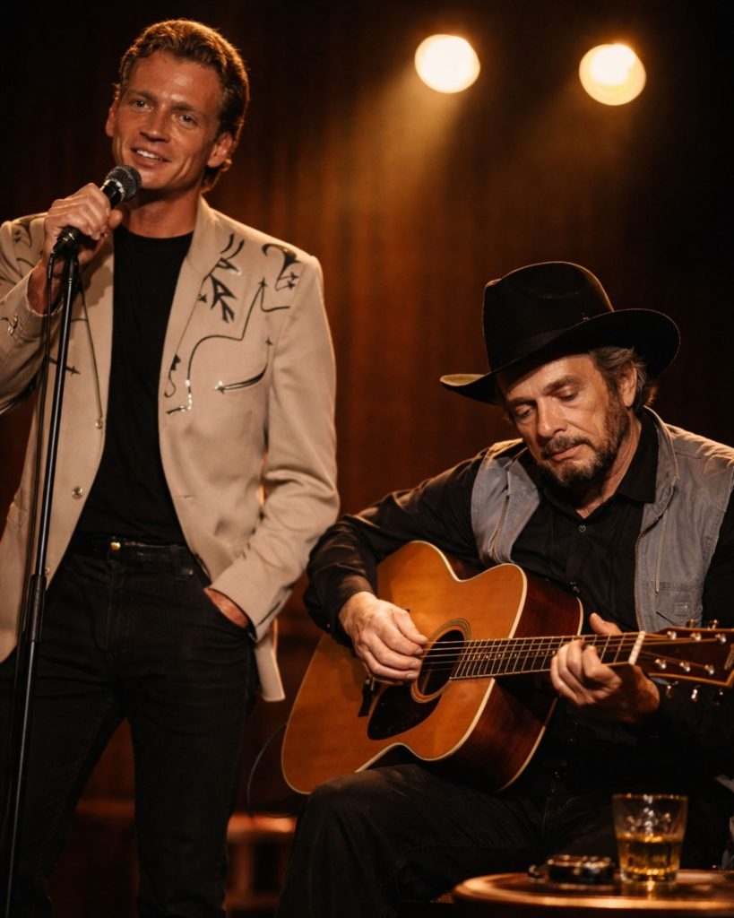 “Silver Wings” had always belonged to Merle Haggard — a song shaped by miles traveled, goodbyes endured, and a voice that carried both pride and regret without needing explanation. When the opening chords began that night, the audience expected familiarity: father and son sharing a melody that bridged generations. For the first half, it unfolded exactly that way. Two voices moving together, steady and balanced.