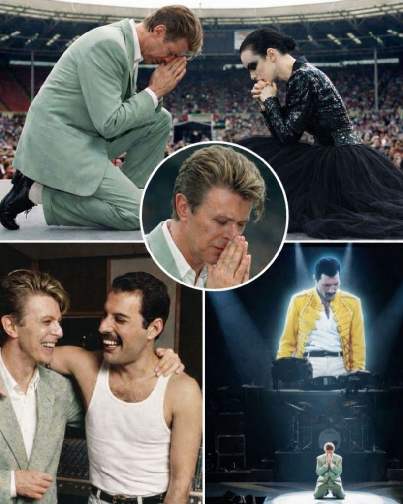 The duet ended exactly the way fans expected: strong vocals, enormous applause, the atmosphere of a stadium concert at full power. But Bowie didn’t step forward to thank the audience or introduce the next act. Instead, he slowly walked to the center of the stage and dropped to his knees. For a moment people thought it might be part of the performance. Then he bowed his head and began quietly reciting the Lord’s Prayer. The vast stadium, filled with tens of thousands of fans who had been cheering only seconds earlier, fell into complete silence.