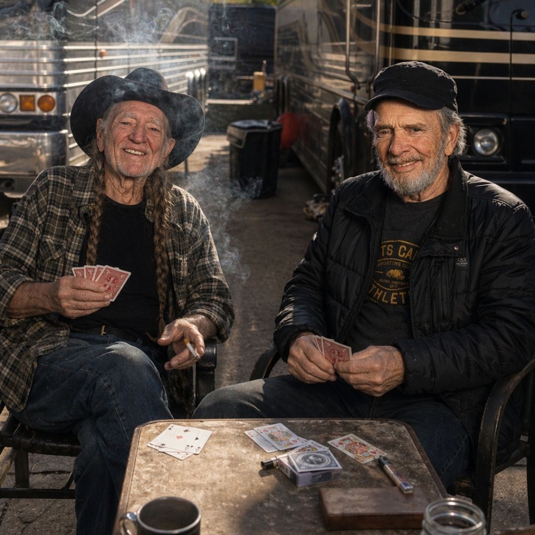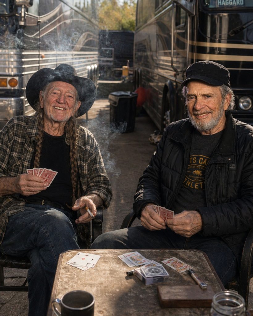 MERLE HAGGARD AND WILLIE NELSON DIDN’T BECOME BROTHERS UNDER STAGE LIGHTS — THEY GOT THERE THE HARD WAY, WITH CARDS, SMOKE, AND TWO TOUR BUSES PARKED SIDE BY SIDE.