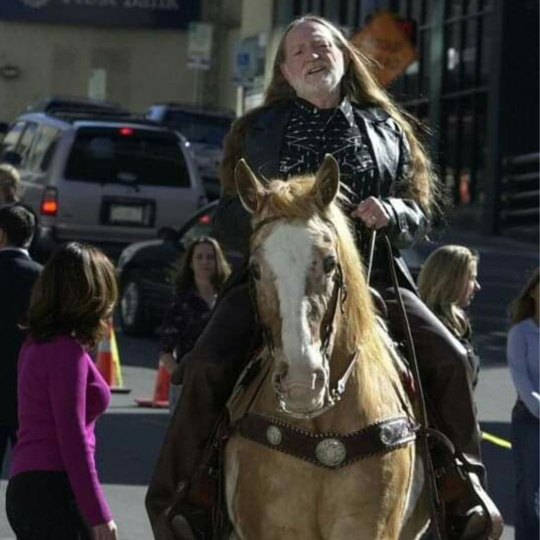 It was a regular morning in Austin — people rushing to work, coffee cups in hand, traffic lights blinking red and green in the usual rhythm of city life. Then, out of nowhere, the sound of hooves echoed between the buildings. Heads turned, conversations stopped, and there he was — Willie Nelson, riding a golden horse straight down Congress Avenue as if time itself had slowed to watch.