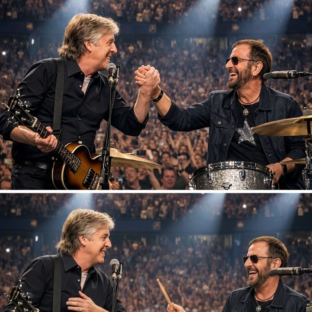 From the side of the stage, Ringo Starr emerged behind a full drum kit, beaming with that familiar, infectious smile. In that instant, the last two living Beatles stood reunited, not in memory or tribute — but in rhythm and reality. Phones trembled. Tears flowed. And thousands witnessed what they never dreamed they’d see again.